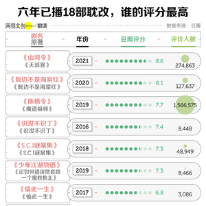 但早在《镇魂》《陈情令》之前,就已经有了多部耽改剧,只不过出圈的不多,2016 年和 2017 年共有 8 部耽改剧播出,但都没什么水花,在豆瓣上评分人数均未超过 1 万。