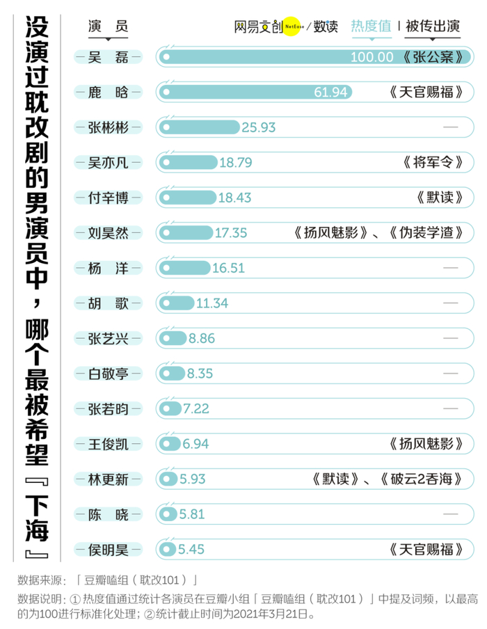 有趣的是,耽改剧演员热度榜前 15 位中,除了茅子俊,剩下的刚好是 7 部热门耽改剧的“官配 CP”。