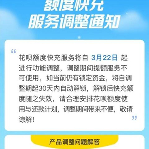 近期支付宝向开通额度快充的所有用户发送了通知。告知用户花呗额度快充服务自3月22日起进行功能调整,调整期间提额服务不可使用,但主动解锁和自动还款功能不受影响。如当前仍在余额宝内有锁定资金,将自调整期起30天内自动解锁资金,解锁后快充额度随之失效。