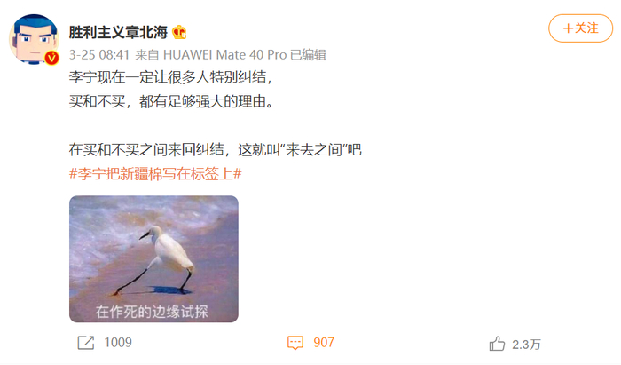 然而在一场猛烈的舆论风暴预期将要袭来的时候,李宁以另一种意想不到的方式上了热搜:有人在支持新疆棉花的同时,发现“李宁原来一直有把采用新疆棉写在标签上”。