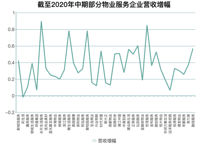 另一方面,市值差异化很大程度上源自部分企业的营收效益表现带给资本市场的想空间。从各家港股物业企业截至2020年中期数据看,38家上市港股物企平均营业收入增速为33.83%。