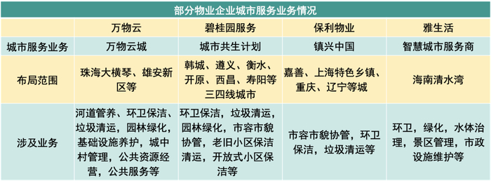 从共性来看,市政环卫是目前头部物业企业试水城市服务的主要切入点,各个已落地项目的业务均有涉及道路清扫、垃圾清运、园林绿化养护等基础内容,可以看作是传统物业"四保"服务场景的延申。