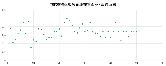 据观点指数监测的数据显示,TOP50企业在管与合约面积比平均值为69%,上图可见头部物业服务企业该指标处于0.4-0.8。当中表现较为优异的物业服务企业有龙湖智慧服务、碧桂园服务及融创服务等。随着企业的拓展动作继续维持,预期上述企业未来的发展势能充足,业绩增长幅度相对较大。