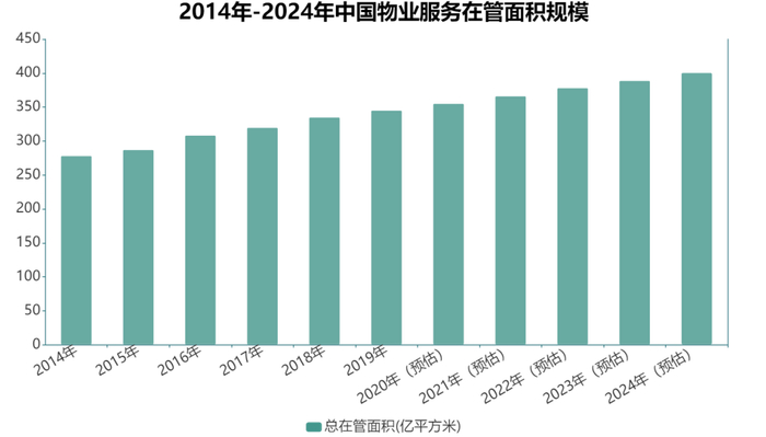 公开数据显示,2014年国内物业服务企业的总在管面积规模为278.24亿平方米。随着行业发展,2019年物业服务企业总在管面积增加至345.18亿平方米,复合增长率达到4.4%,而到了2020年,预计国内物业服务企业的总在管面积可以达到355.19亿平方米。
