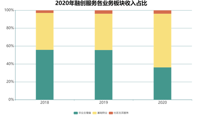 通过观察某物业公司的财报,可以看到其2020年业主增值服务、非业主增值服务增长势头不一,其中业主增值服务获得大幅度增长,2020年业主增值服务收入同比增长116.9%,而非业主增值服务收入同比增长率为37.5%,非业主增值服务的增速低于业主增值服务收入。