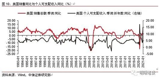 如何看待美国新一轮库存周期的开启?我们认为销售同比上升代表的需求回暖是其背后的重要影响因素,而销售同比的回升或与美国个人可支配收入的提升有关。从美国库存总额同比与销售总额同比的历史关系来看,二者走势具有同步性,同时销售同比增速在一定程度上具有领先特征,需求的回暖激发了企业补库的积极性。而带来销售回升的原因,我们认为或与美国当前经济修复以及多轮财政刺激下带来的美国个人可支配水平的提升有关。从美国销售总额同比与个人可支配收入同比增速的历史走势来看,二者总体呈现出正向相关关系,当个人可支配收入增速提升时,居民消费增速通常也伴随走高。在去年新冠疫情背景下,居民就业受到明显影响,居民收入承受压力,但美国多轮财政刺激政策通过补贴形式加快了居民可支配收入水平的回升速度,包括拜登最新推出的1.9万亿财政刺激计划当中也涵盖了个人补贴和失业救济项目,因此当前美国销售同比的回升或与美国个人可支配收入的提升有关。
