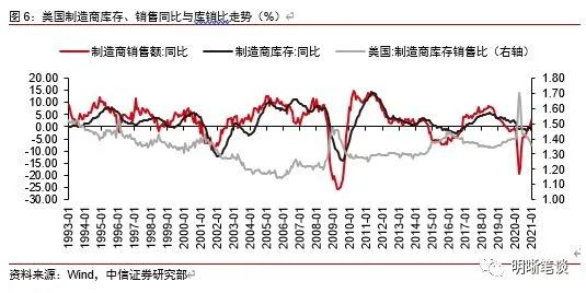 从销售同比与库存销售比表现来看,当前美国需求表现较强,库存周期的上行反映了在较强需求下企业的主动补库行为。对于库存周期所处的阶段,在库存增速上升时期,存在主动补库存和被动补库存两个阶段,库存周期的产生来源于生产端与需求端的错位,主动补库存阶段需求端表现较强,而随着需求逐渐放缓,库存周期便步入被动补库存阶段。对于库存周期阶段的判断,销售同比和库存销售比的表现将给我们提供很重要的参照。从当前美国库存同比、销售同比以及库销比的表现来看,在去年疫情的影响之下,美国库存同比和销售同比均经历了较为严重的冲击,在疫情导致的社交隔离影响下,美国销售受到的打击更为严重,而当前美国销售同比增速出现明显反弹,反映在疫情逐步得到控制以及疫苗接种推进背景下,需求端的明显修复。与此同时我们注意到当前美国库存销售比正处于下降的趋势当中,库存销售比指库存量与销售额的比率,在需求恢复的背景下,库销比的下降加上当前的库存同比上行,反映出当前美国库存周期所处的阶段为较强需求下企业主动补库阶段。