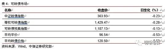 3月25日转债市场,中证转债指数收于363.93点,日下跌0.23%,等权可转债指数收于1,429.47点,日下跌0.28%,可转债预案指数收于1,187.13点,日下跌0.13%;平均平价为96.54元,日下跌0.53%,平均转债价格为120.50元,日下跌0.53%。339支上市交易可转债(辉丰转债除外),除冀东转债停盘,翔鹭转债、百川转债、中金转债、万青转债和奥瑞转债横盘外,97支上涨,236支下跌。其中英特转债(9.79%)、起步转债(7.43%)和迪龙转债(7.21%)领涨,小康转债(-8.48%)、英科转债(-5.59%)和明泰转债(-4.37%)领跌。335支可转债正股(*ST辉丰除外),除冀东水泥停盘,高澜股份、塞力医疗、盛屯矿业、天目湖、天汽模、烽火通信、长久物流和湖北广电横盘外,127支上涨,199支下跌。其中搜于特(10.17%)、雪迪龙(10.01%)和起步股份(9.97%)领涨,福能股份(-9.97%)、小康股份(-9.37%)和九洲集团(-7.34%)领跌。