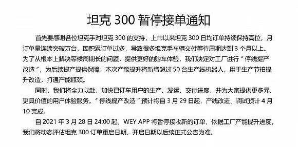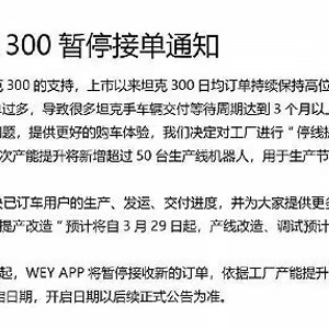 原标题:需求过大、产能不足,WEY宣布坦克300车型停止接单