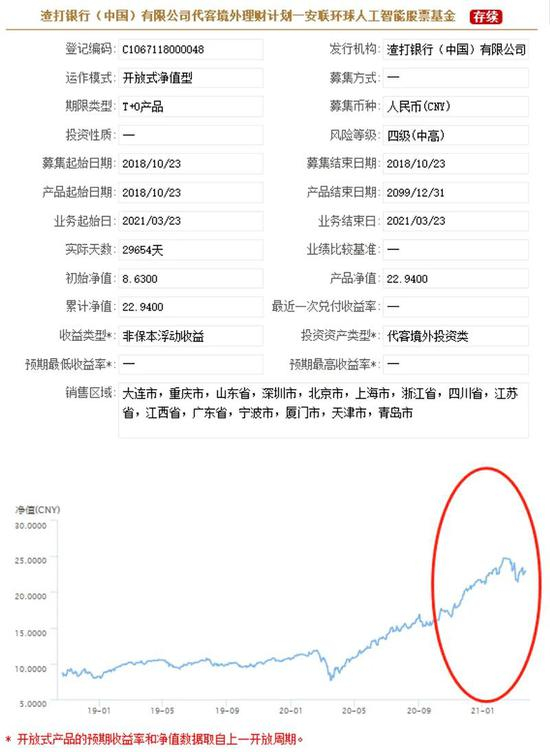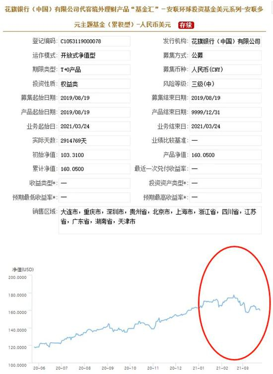 再如,花旗银行(中国)代客境外理财产品“安联环球投资基金美元系列—安联多元”主题基金,投资性质属于权益性,风险等级三级。自2019年8月募集以来,净值由103.31上涨至160.05。虽然从今年2月中旬后有小幅回撤,但其近半年来的净值涨幅在15%左右。