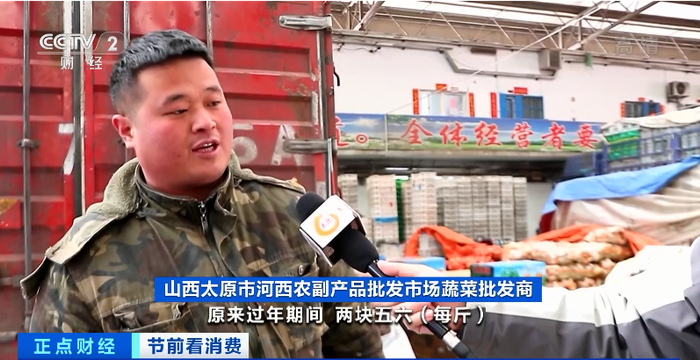 山西太原市河西农副产品批发市场蔬菜批发商:比如娃娃菜,原来过年期间每斤两块五六,现在一块三降了一半。
