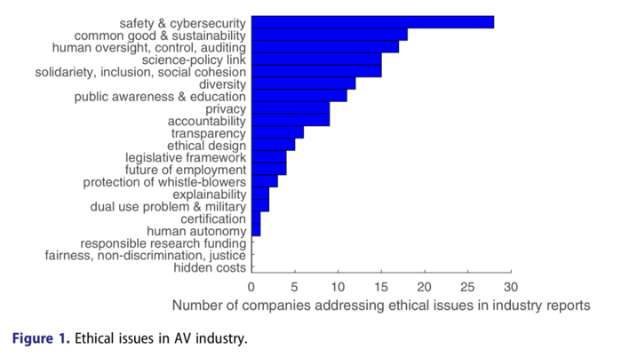 来自荷兰代尔夫特理工大学的Andreia Martinho、Nils Herber、Maarten Kroesen和Caspar Chorus在期刊《交通评论》(Transport Reviews)上发表题为《自动驾驶汽车产业聚焦的伦理问题》的论文,旨在挖掘行业内私人企业对自动驾驶汽车伦理道德的站位。参考Hagendorff(2020)整理的22份人工智能伦理准则,文章提炼学界和业界叙述的道德倾向和关注焦点,反映两者在自动驾驶汽车伦理问题上的分歧。Martinho等人提出,道德决策与法律问责的联结和边界也是学界和业界关注的重点。现有研究提出,要制定至少一个能够承担自动驾驶汽车行为后果的人类代理人,可能是车辆设计人员或远程操作员。但硅谷法律集团的Stephen S. Wu提出,在设计碰撞躲避算法时,自动驾驶汽车的既定道德选择往往产生高法律责任的诉讼结果,自动驾驶汽车的责任困境亦不容忽视。对于企业而言,决策者更倾向于投资一种最低责任风险的设计策略,该策略依赖于规章制度、推进调查和撞车/碰撞规避算法。Martinho等人的研究发现“安全和信息保护”是较多公司重视的道德问题;其次是共同利益、可持续性和福祉,人为监督、控制和审计,以及与科学政策间的联系;相较之下,诸如隐性成本、公平公正和非歧视、负责任的研究资助等问题在这些报告中均未提及。与学界不同,企业的态度更加务实,更加注重现行法规下的最低责任风险和消费者信任危机的平衡。“谁生谁死”的道德困境依然存在。业界最关注的是,如何通过技术手段,利用更强大的人工智能算法、更精准的传感和定位设备、更完善的智能基础设施建设,来尽可能规避上路时的风险。该文以戴姆勒发布的2018年度可持续报告和《重塑安全:自动驾驶系统的联合方案》(Reinventing safety: a joint approach to automated driving systems)为例,阐述车企对智能汽车的安全提升和信息保护倾向:为使自动驾驶汽车更好地适应日常交通状况,戴姆勒联合博世开发了基于传感器、执行器和计算资源的检测响应系统(OEDR),通过分析车辆在行驶过程中遇到的各类场景来提升自动驾驶车辆的OEDR能力,包括环境感知、场景建模、仿真模型、行为规划、人机交互、应急和最小风险预案等,以确保在个别零部件出现故障时车辆仍能做出适当反应;建立在“汽车用户隐私准则”的基础上,梅赛德斯-奔驰正视数据隐私的重要性,并在法律框架下开发实用的数据保护解决方案,为个人识别信息建立保护措施。
