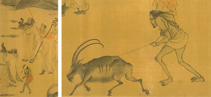 综合这些图像可以发现,“尖趾化”的细节大多表现在域外来者身上,其身份并非十分明确,往往被统称为“胡人”。这些细节加之史料中对于胡人形象的描述“深目,高鼻,多须髯”等成为其独特的形象标识,样貌独特迥异于中原人。在传世绘画中将胡人的脚趾进行这样的异化处理,如狮子等野兽的“尖趾”,似乎带有所谓“夷夏之别” 的态度暗示。如《太平广记》引《幽冥录》,提及晋元帝时士人某甲与胡人还魂换脚的故事,即呈现了士人对胡人的厌恶之态:“晋元帝世,有甲者,衣冠族姓,暴病亡,见人将上天,诣司命,司命更推校,算历未尽,不应枉召。主者发遣令还。甲尤脚痛,不能行……司命思之良久,曰:适新召胡人康乙者,在西门外。此人当遂死,其脚甚健,易之,彼此无损。主者承教出,将易之。胡形体甚丑,脚殊可恶……豁然复生,具为家人说。发视,果是胡脚,丛毛连结,且胡臭。甲本士,爱玩手足。而忽得此,了不欲见。虽获更活,每惆怅,殆欲如死。……终身憎秽,未曾悮视。虽三伏盛暑,必复重衣,无暂露也。”