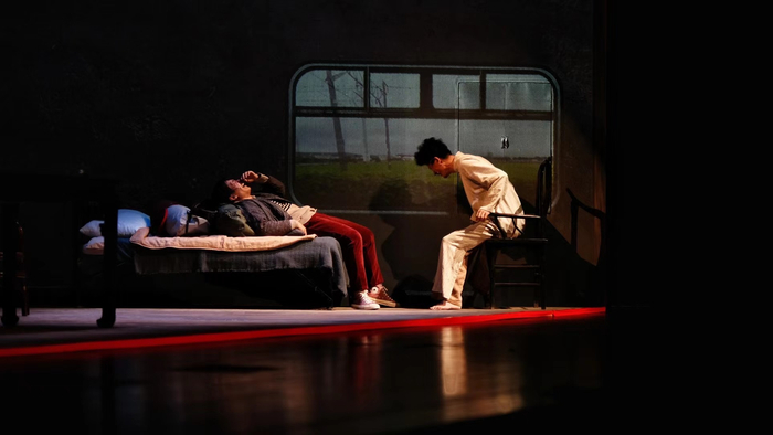 第八则日记比较完整地出现在第二幕第二场《火车上的青年人》中。狂人与青年的对话核心来自原作,又做了相应的拓展。火车上的场景以及模拟的车窗外影像则是陆帕先生创造出来的。我仔细观察车窗外的场景具有两个特点,一个是现代,楼房桥梁等等物象全是现代的,第二个是循环,影像是循环使用的,证明这段场景的不真实或者是出自狂人的想象。更别提青年双肩背包这一道具提示的年代感。这种影像辅助和之前众人围观的影像不知怎地让我想起费里尼《女人国》里的火车车厢场景。看客的身份,究竟是狂人站在舞台铁架高处俯瞰剧场或者远方显示的还是舞台影像显示的,这个问题其实观众自己也是能分辨的。