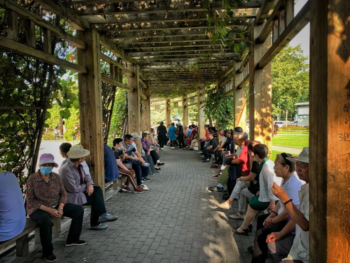 鹤岗的零公里广场,老人们坐在长椅上聊天