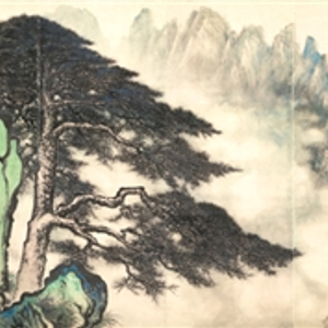 黎雄才先生对松树题材的研究,是其艺术创作的重要组成部分。这幅《迎客松》创作于1975年,画面远景为峻秀群峰,云雾萦绕其间,前景的迎客松傲立峭壁,郁郁苍苍。作品整体气魄沉雄,墨气淋漓。其中松树超越了传统中国画中的点缀作用,成为画面中具有核心审美价值的一种精神表达。