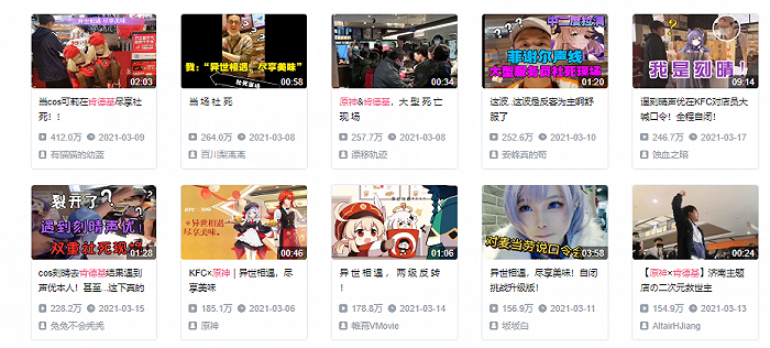 3月7日,《原神》官方在微博发布的联动预告,玩家购买指定套餐并对店员说出口令“异世相遇,尽享美味”,才能获取联动徽章,这一羞耻度极高的口令直接成为up主们吐槽和梗图制作最好素材。自活动预热活动开始,B站出现了大量百万播放量以上活动视频,其中的精品作品还被同步到微博、贴吧等其他社区。