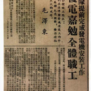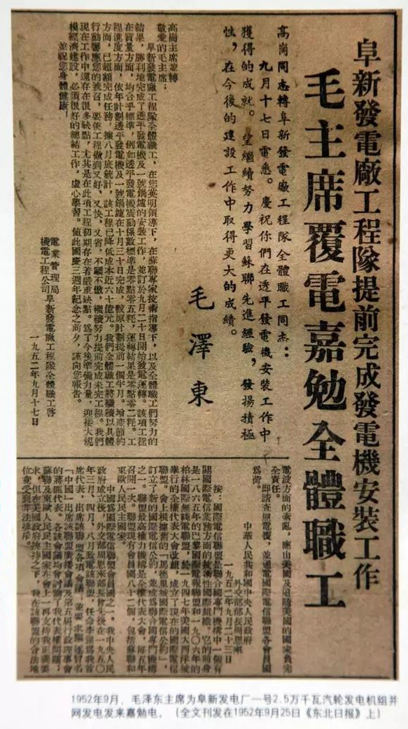 1952年9月17日,我国第一台装机容量为2.5万千瓦的汽轮发电机组在阜新发电厂安装成功,毛泽东主席亲自发来嘉勉电,高度赞扬并肯定了电力建设职工的工作和创举。
