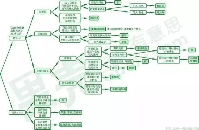 蔷薇科传统上分为四个亚科,其中花期春季的蔷薇科木本植物大多属于苹果亚科和李亚科。属于苹果亚科的种类子房下位(位于下方),而李亚科子房上位。李亚科的物种一般花柱只有一枚,苹果亚科的花柱通常是多枚的,可以从这几个特征的不同,迅速的把桃李樱杏和苹果梨区别开来。
