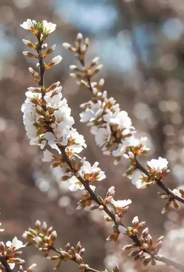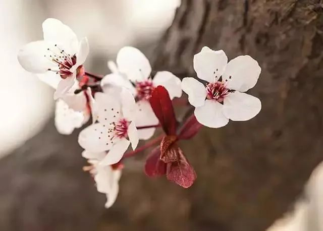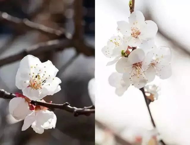 樱李梅的花真正的李则没有那么艳丽的色彩,城市之外的郊区乡村更为多见,纯白色的花具有长梗,通常两至三朵并生于枝端,花叶几乎同出。