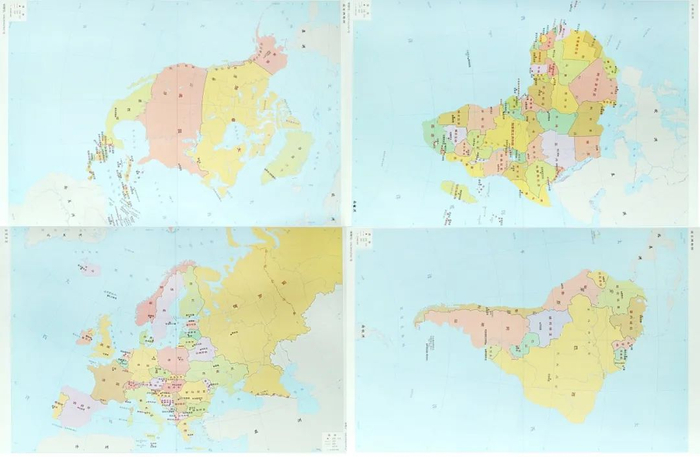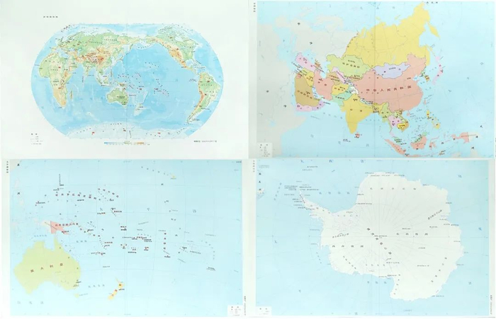 世界地形图、欧洲地图、亚洲地图、大洋洲地图、北美洲地图、南美洲地图、非洲地图、南极洲地图各1张。
