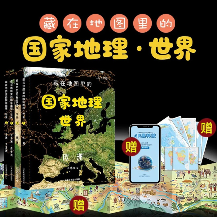 除了北斗AR实景地球仪,这套《玩转地球》还含有四册《藏在地图里的国家地理·世界》。