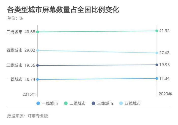 四线城市的两个指标则出现“双降”,影院数量占比从2015年35.83%降至2020年33.39%,银幕数量占比则从2015年29.02%降至2020年27.42%。