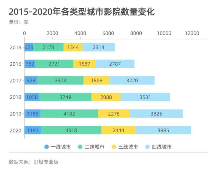从城市分类数据来看,“十三五”期间,北京、上海、广州、深圳4座一线城市拿下10%左右的新增影院和银幕,242座四线城市却只收获30%的新增影院和26%的新增银幕。