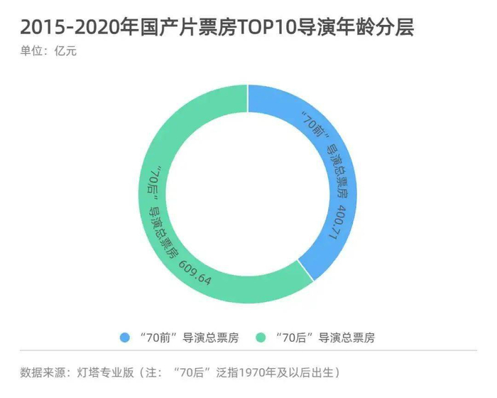 从创作者角度来看,徐峥、陈思诚、吴京等70后、80后导演迅速崛起,是国产片高票房影片的主要缔造者。2015-2020年,历年国产片票房TOP10电影中,70后、80后导演拍摄影片总计占据60%份额,贡献610亿元票房,占总票房51%,是中国电影市场上不可或缺的中坚力量。