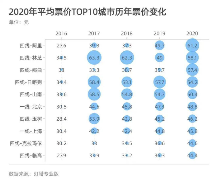 对比发现,当北京、上海、广州、深圳的平均票价还在40-50元区间时,诸如林芝、山南、日喀则、昌都、凉山、玉树这些城市的平均票价已突破50元大关。
