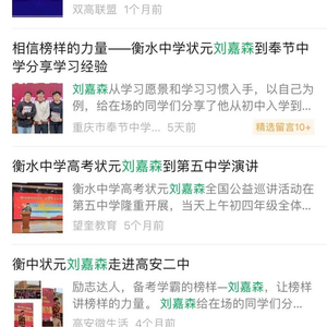 在微信上搜索“刘嘉森”,搜索结果非常惊人,他的名字出现在无数学校的公众号里,文章标题都是《衡水中学状元刘嘉森走进XX中学,分享学习经验》。