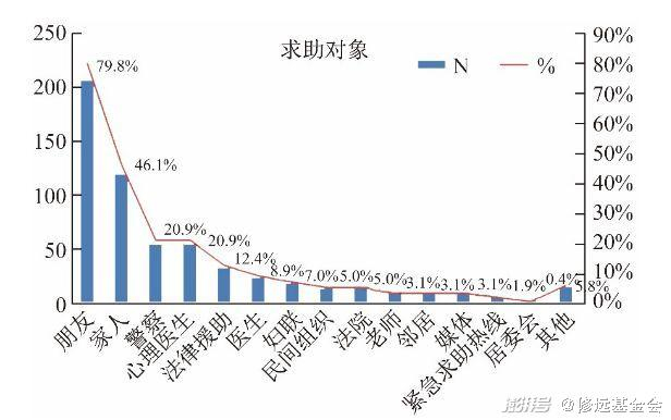 这与2015年“反家庭暴力立法民间倡导工作组”的《亲密关系中的暴力网络调查报告》有着一致性:在这份参与者平均年龄26岁、30岁及以下人群占样本总量约81%的调查中, 258人曾在遭遇暴力之后寻求过帮助, 其中朋友、家人、警察与心理医生位居求助对象前四位, 警察与心理医生占据了青年群体求助的重要位置, 妇联和邻居则分别排在了第7位和第11位。