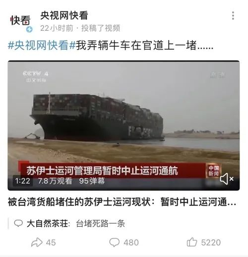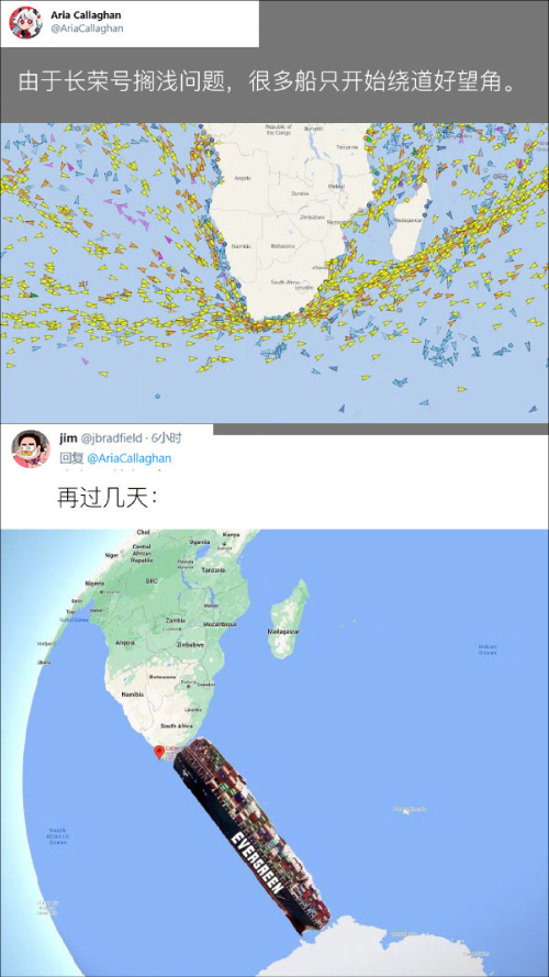 还有网友表示,现在苏伊士运河被堵,大量货船要绕道好望角,那过几天会不会有艘“长赐号Plus”把好望角也给堵了?