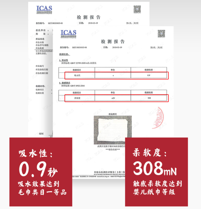 在最新的专业检测报告中,拾柒棉触感柔软度竟达到婴儿纸巾等级哦~
