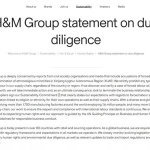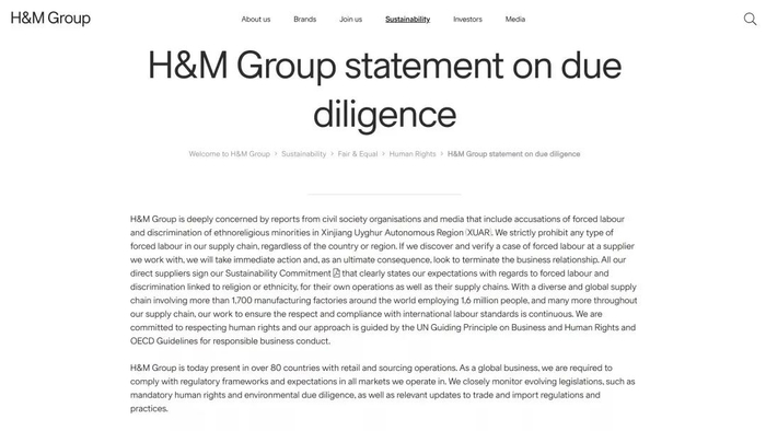 近日,H&M在其集团官网发布了一则“关于尽职调查的声明”,该品牌以新疆维吾尔自治区“强迫劳动”为由,停止使用新疆生产的棉花。