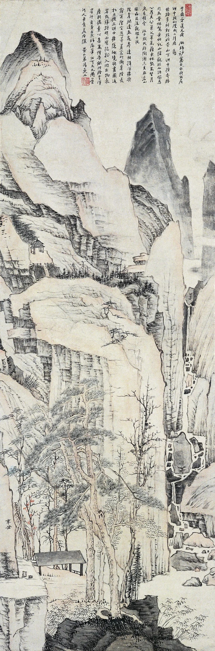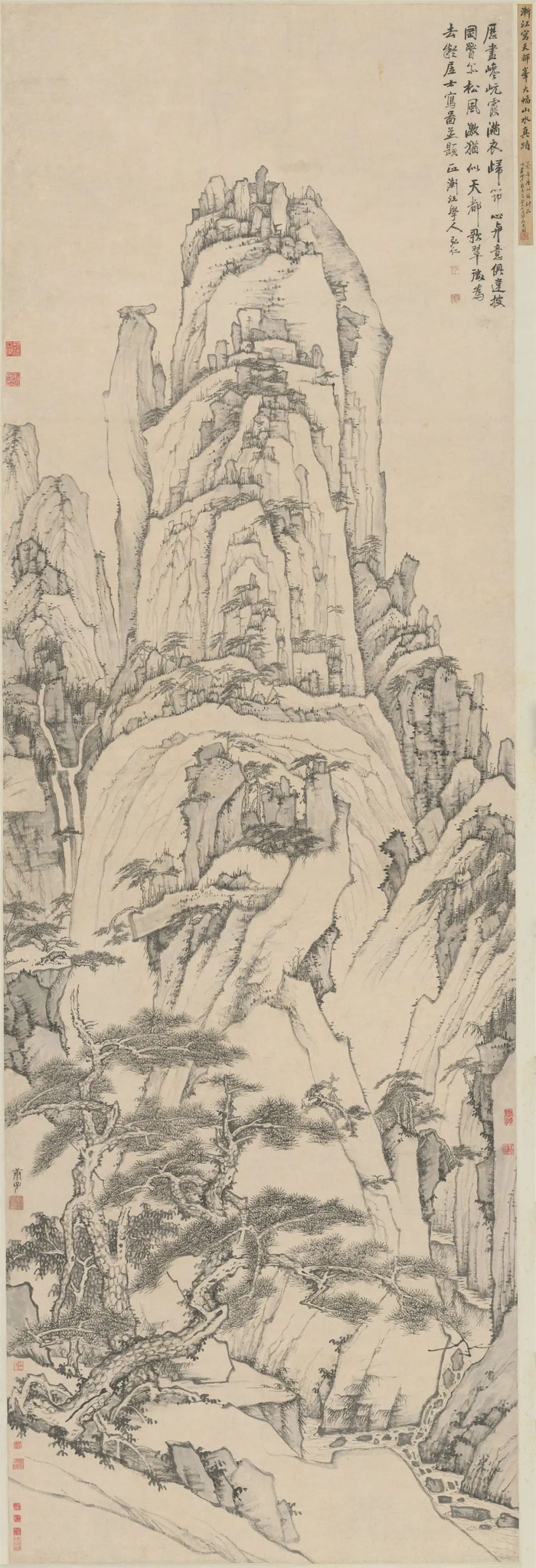 渐江(1610—1664),安徽歙县人,俗姓江,名韬,字六奇,又名舫,字鸥盟。明亡后于福建武夷山出家为僧,字渐江,号梅花古衲。自武夷山返回歙县之后的十余年中,黄山是渐江每年的必至之处,黄山的一松一石皆已贮其胸腹之中,正如渐江诗云“黄山影里是予栖”,可见黄山不啻为渐江的精神家园和灵魂栖息地。在与黄山的心灵交融之中,渐江以独特的笔墨创造性地描绘了黄山。渐江自言“敢言天地是吾师,万壑千岩独杖藜。”其师法造化,荡尽尘浊,画中得黄山之真性即是自身画写性灵的集中体现。