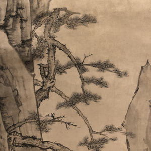 虽取法云林,渐江所作的黄山诸景却不受倪瓒画法约束,在构图上洗练简逸,笔墨苍劲整洁,善用折带皴和干笔渴墨,其作品格调不同于倪瓒,少荒凉寂寞之境,而多清新之意。如此次展出的《天都峰图》轴、《黄山图》轴都可见出其独特的艺术风貌。其中《天都峰图》轴描绘的是黄山的天都峰,山峰造型处理得简洁凝练,以刚劲笔线勾勒出其空灵峭健的英姿,一山一石似有千山万石之感。该图从画面下方的涧溪潺潺,到悬崖边的虬曲古松,形如盘龙出水,整个近景约占画幅面积的三分之一,形成符合视觉面积对比的构成美感。中景和远景峰峦叠嶂,龙脉迂回,直指霄汉的主峰,其面积比例约占构图的三分之二。画面的空间比例分割具有很强的形式美感,画面景致峰峦起伏,高低错落有致,奇松点缀其中,星星点点;水流顺山体直泻而下,幽静的山路隐现出山体透视空间的走势和幽深的意境,其构图形式简洁又不失苍劲之气,折射出弘仁独特的风骨与气质。