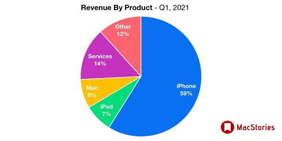 从苹果2021年第一季度财报来看,在创新高的1114亿美元营收中,苹果依靠iPhone、iPad、Mac、可穿戴设备及配件等硬件产品收入956.7亿美元,约占单季度营收的86%。