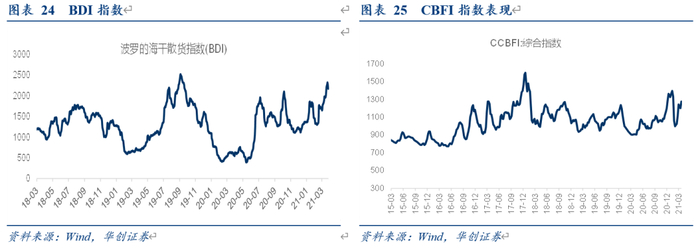 干散货:BDI周下跌4.5%,收于2178点,2021Q1均值1721,同比增191%。CBFI周上涨6.3%,收于1274点。