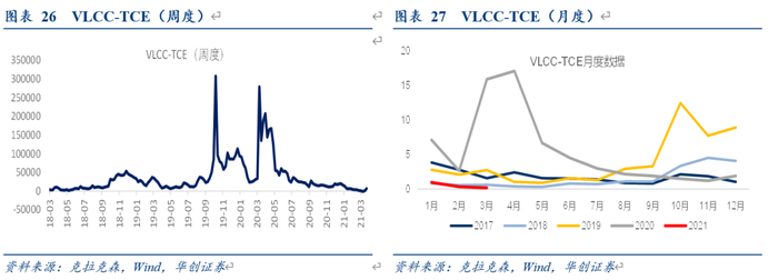 油运:VLCC-TCE报0.67万美元,环比+1667%。2021Q1均值0.53万美元,同比-94%。