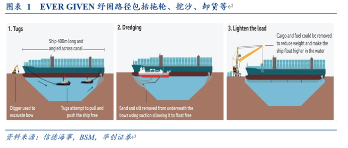 目前“EVER GIVEN”仍处于疏浚、脱浅过程中,当地时间3月26日起浮尝试再次失败,后续脱困时间尚不确定,可能数日至数周不等,考虑到“EVER GIVEN”即使脱困后驶出运河也需要时间,预计苏伊士运河临时关闭或至少持续1-2周,将造成亚欧重要海运通道较大程度堵塞。