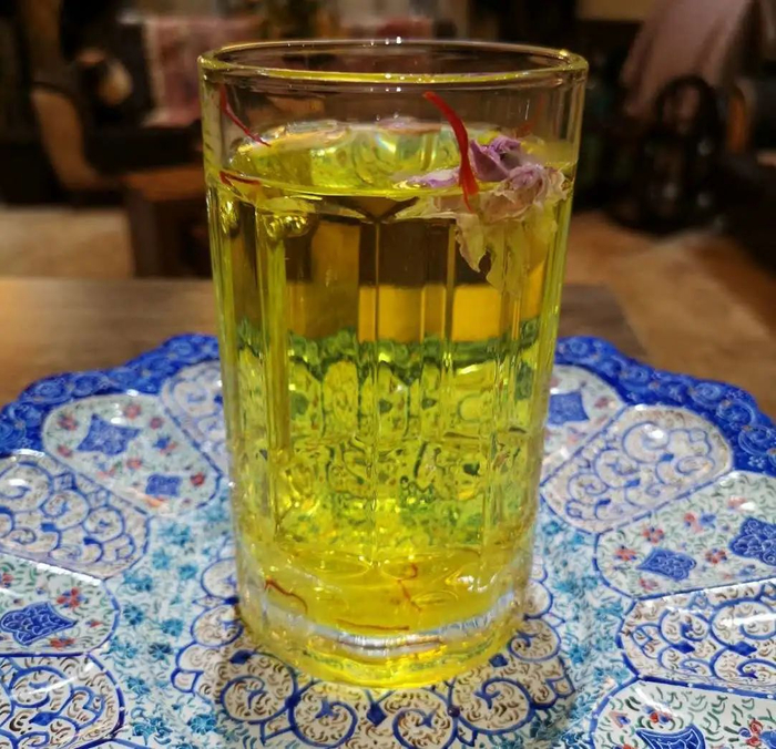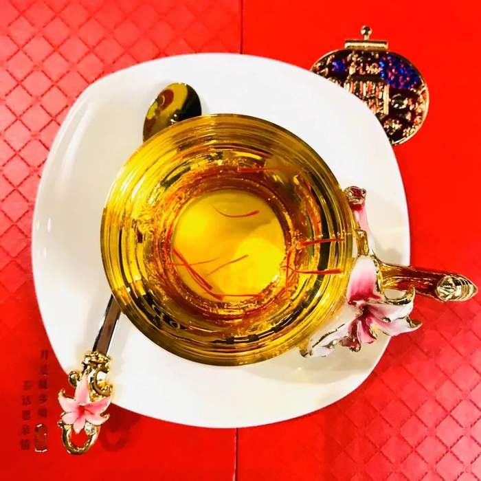 别看名字叫藏红花,可里面的藏红花苷却是有着金黄色的“血脉”。也是因为这样,伊朗人常常把藏红花泡出来的茶颜色叫“帝王之色”。