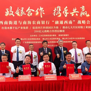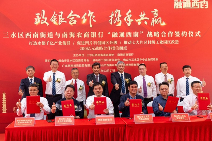 落成典礼后,三水区西南街道与南海农商银行“融通西南”战略合作签约仪式隆重举行,南海农商银行和佛山市三水区西南总商会、佛山市三水区青年商会、佛山市三水区中小企业促进会、广东西南投资控股有限公司、佛山市西南水都饮料基地投资有限公司等单位签署合作协议,战略授信额高达200亿元!