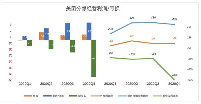 二是外卖业务本身盈利能力低下:2020年完成101.5亿单,经营利润28.3亿,利润率4.3%。要不是外卖业务获得76亿广告收入,这个部分是亏损的!