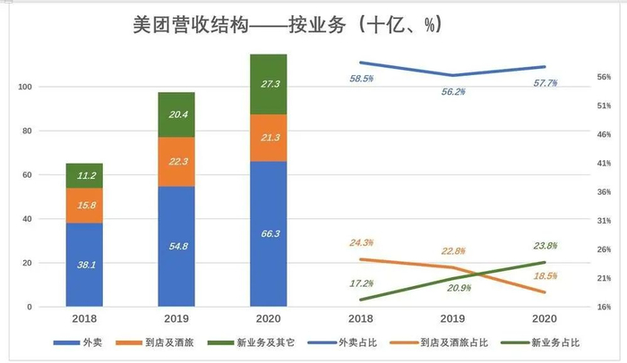2018年,美团佣金收入470亿,占总营收的72.1%;2020年佣金收入增至742亿,占总营收的比例降至64.6%;