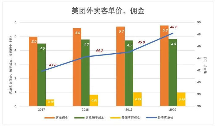 2020年,美团外卖平均客单价升至48.2元,平均每单收取佣金5.77元(2019年为5.69元),平均每单支付骑手成本4.8元(2019年为4.71元),美团净得0.98元(2019年净得0.99元)。