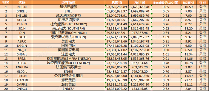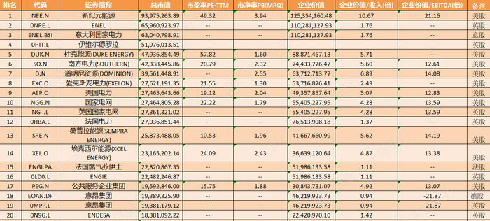 1) 新纪元能源[NEE.N]:美国佛州最大、全美第四大电力公司,致力于提供与电力有关的服务,旗下拥有佛罗里达电力照明公司和NextEra能源资源公司两大子公司。公司提供零售和批发电服务超过500万客户,拥有发电,输电和配电设施,以支持其业务。它还购买电力转售给客户,并提供相关的电力和天然气的消耗与自己的发电资产和批发客户在选定的市场上数量有限的风险管理服务。NEE是在北美可再生能源从风和太阳最大的发电机。