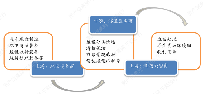 环卫行业产业链的上游主要为生产环卫清洁装备、垃圾处理装备等的环卫装备商,中游即为环卫服务商,负责垃圾分类清运、清扫保洁等,下游为固废处理商,进行垃圾处理,再生资源环境回收利用等。