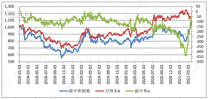 碳中和指数已经经历过两个波段,自2017年12月31日至2018年10月18日下跌44%,最小值为557点,历时209个工作日,随后至2021年3月26日上涨90%,历时637工作日,最大值位于2021年3月22日的1061.51点。