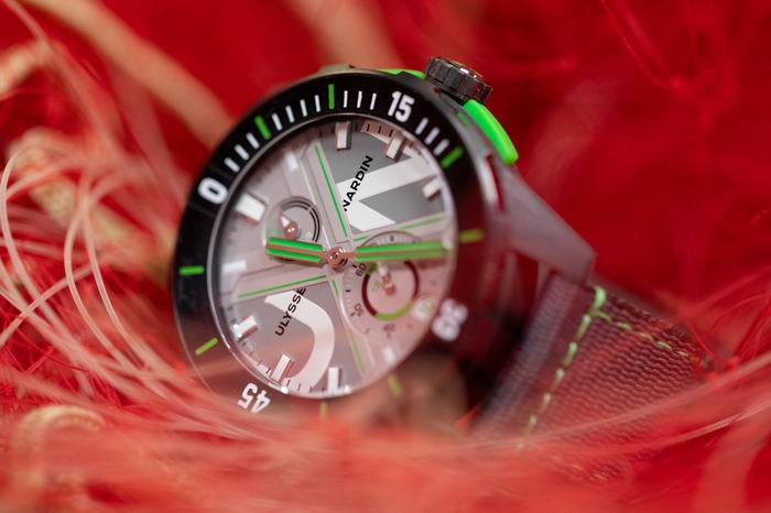 DIVER NET的表壳、表壳中层、表背以及表圈上的装饰细节出自三名来自法国布列塔尼的年轻设计师之手。他们成立了法国第一个专注于渔网回收与再生利用的机构——FIL&FAB,从港口回收废弃渔网,随后加工成聚酰胺塑胶粒,这种原料具有出色的耐磨损性。